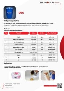 The Diethylene Glycol is a Shazand Petrochemical product. You can see the technical specifications of DEG | Diethylene Glycol in the following datasheet